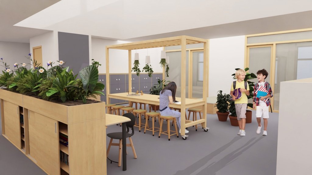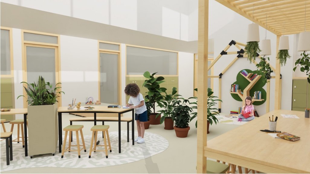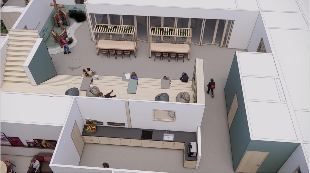 We krijgen 4 verschillende "habitats". In iedere habitat zit een bouw. Beneden is de habitat van de groepen 1-2 en komt er een kinderdagopvang met 3 groepsruimte. Op de verdieping komen de stamgroepen 3-4, 5-6 en 7-8.